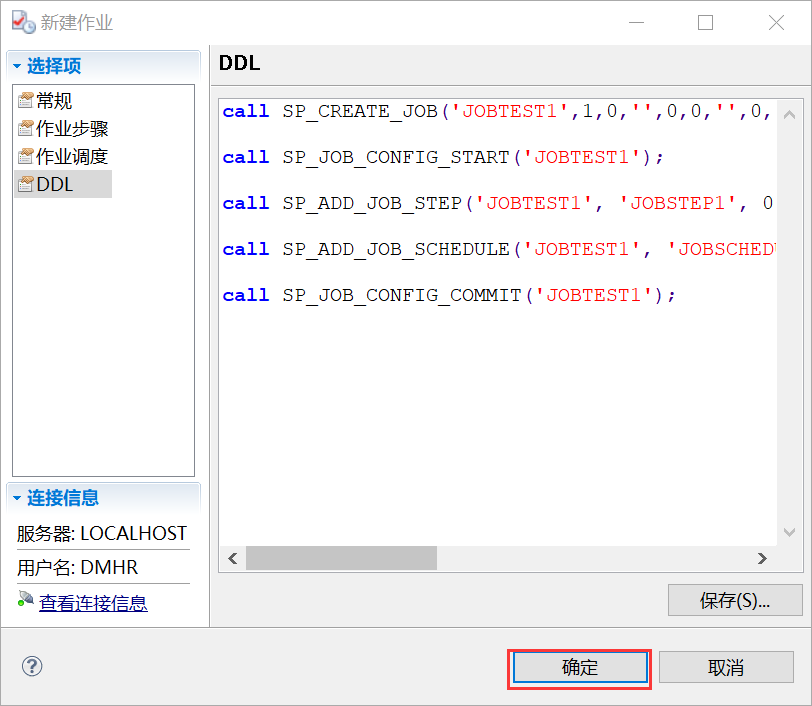 此时,创建作业的步骤已基本完成,在新建作业页面点击“DDL”页签,可以看到上述步骤的操作语句。点击【确定】,JOB创建完成。