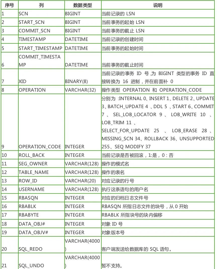V$LOGMNR_CONTENTS显示当前会话日志分析的内容。此动态视图与 Oracle 兼容,下表中未列出的列 DM 暂不支持,查询时均显示 NULL。
