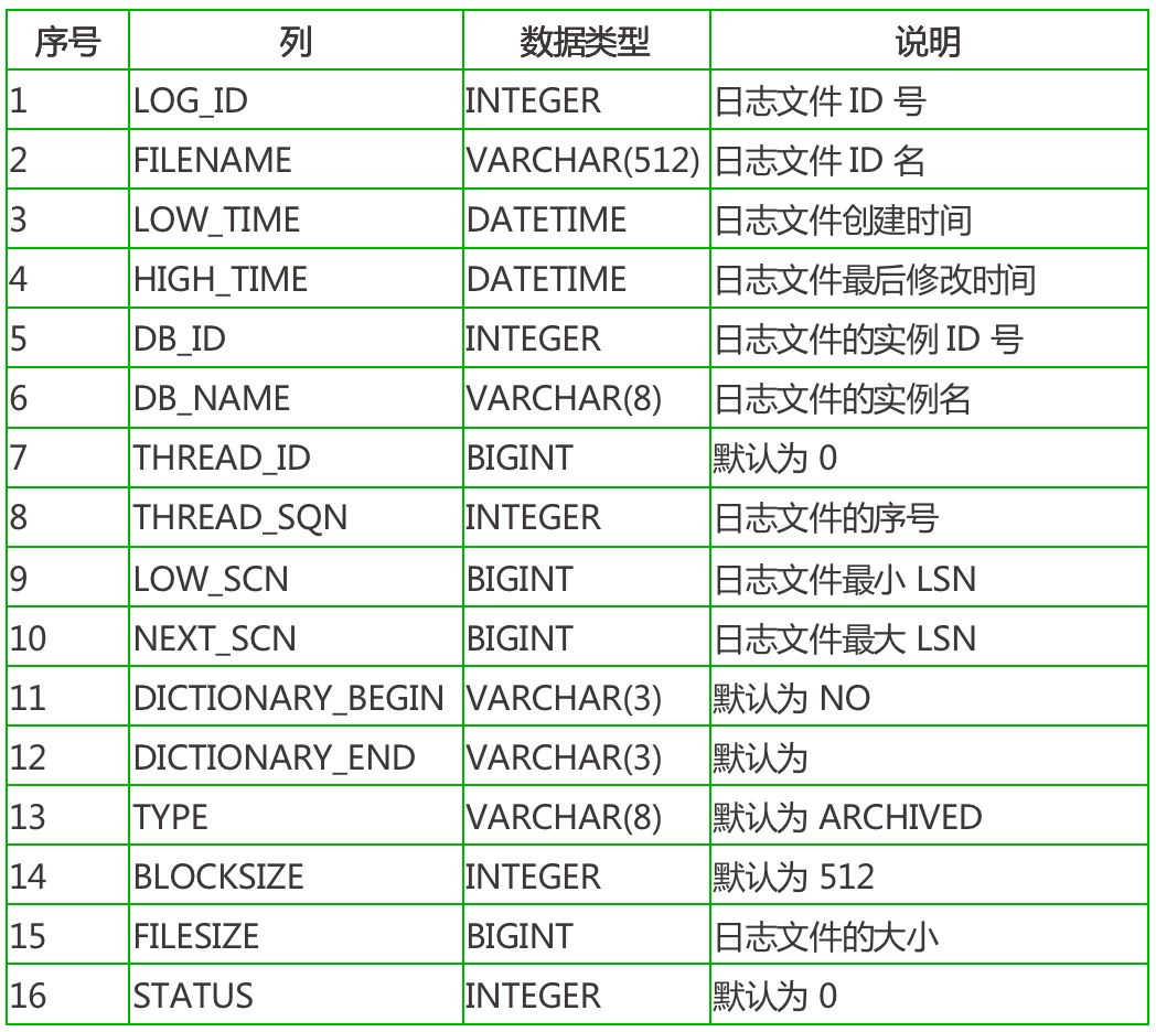V$LOGMNR_LOGS显示当前会话添加的需要分析的归档日志文件。此动态视图与 Oracle 兼容,下表中未列出的列 DM 暂不支持,查询时均显示 NULL。