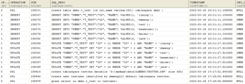 查询结果展示如下图,从SQL_REDO字段中可以看出包含了我们步骤2中执行的所有操作。