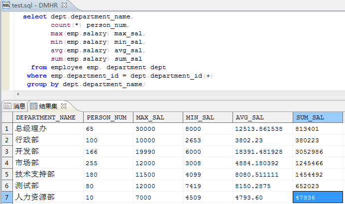 AVG|MAX|MIN|COUNT|SUM以查询DMHR样例数据库中某公司每个部门的总人数,部门最高、最低、平均薪资水平,薪资总和为例,来展示各函数的查询用途。 select dept.department_name, from employee emp, department dept where emp.department_id = dept.department_id(+) groupby dept.department_name;输出结果展示如下(数值列依次为本部门员工数,最大薪资数,最小薪资数,平均薪资数,薪资总和):