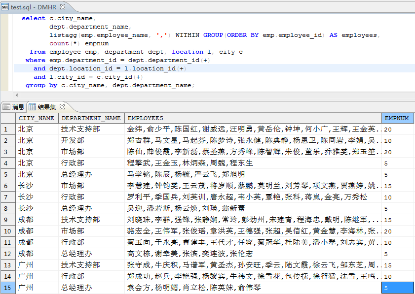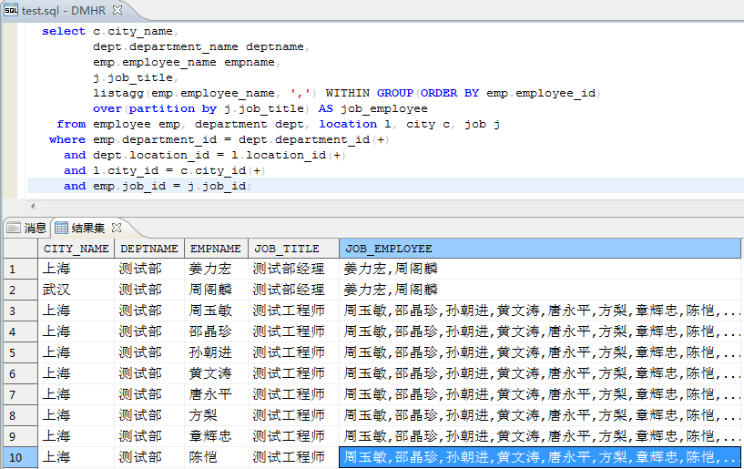 LISTAGG用于做字符串之间的连接,即可以做集函数,也可以做分析函数。LISTAGG2不支持分析函数。比如查询公司员工信息,并同步获取相同工种的员工名单,dept.department_name deptname,emp.employee_name empname,listagg(emp.employee_name,',') within group(orderby emp.employee_id)over(partitionby j.job_title)as job_employeefrom employee emp, department dept,location l, city c, job jwhere emp.department_id = dept.department_id(+)and dept.location_id = l.location_id(+)and l.city_id = c.city_id(+)and emp.job_id = j.job_id;输出结果展示如下(最后一列为该员工相同工种的员工名单):