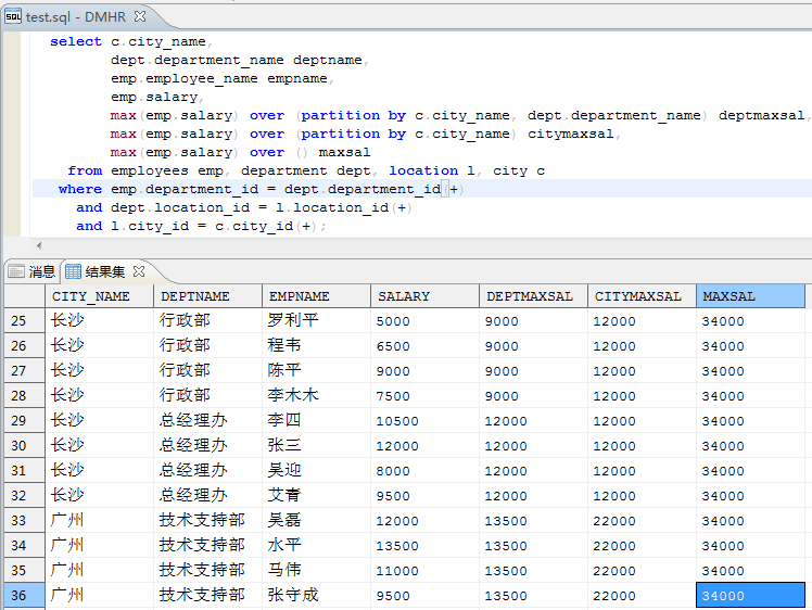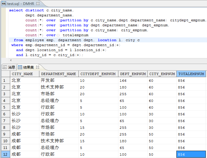 AVG|MAX|MIN|COUNT|SUM平均值|最大值|最小值|总个数|求总和也是最常用的分析函数。① 以查询DMHR样例数据库中某公司部门人员薪资,部门最高薪资,区域最高薪资,公司最高薪资为例,来展示聚合分析函数的查询用途。dept.department_name deptname,emp.employee_name empname,max(emp.salary)over(partitionby c.city_name, dept.department_name) deptmaxsal, max(emp.salary)over(partitionby c.city_name) citymaxsal, max(emp.salary)over() maxsalfrom employees emp, department dept,location l, city cwhere emp.department_id = dept.department_id(+)and dept.location_id = l.location_id(+)and l.city_id = c.city_id(+);输出结果展示如下(数值项依次为员工个人薪资、部门最高薪资、区域最高薪资、公司最高薪资):② 以查询DMHR样例数据库中某公司区域部门人员总数,部门人员总数,区域人员总数,总司总员工人数为例,来展示聚合分析函数的查询用途。select distinct c.city_name,count(*)over(partitionby c.city_name,dept.department_name) citydept_empnum, count(*)over(partitionby dept.department_name) dept_empnum,count(*)over(partitionby c.city_name) city_empnum,count(*)over() totalempnum from employee emp, department dept,location l, city cwhere emp.department_id = dept.department_id(+) and dept.location_id = l.location_id(+) and l.city_id = c.city_id(+);输出结果展示如下(数值项依次为各区域部门员工数、各部门员工数、各区域员工数、公司员工总数):