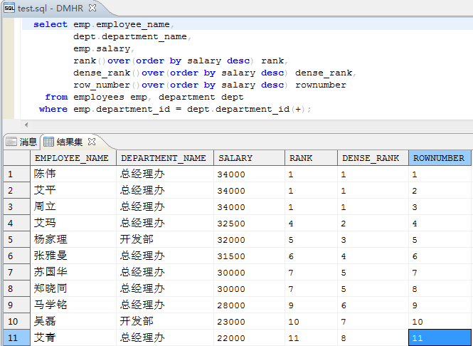 此三个函数用于对数据排序,生成排行榜的场景,为每条记录产生一个从1开始至n的自然数,n的值可能小于等于记录的总数。这3个函数的唯一区别在于当碰到相同数据时的排名策略。ROW_NUMBER:当碰到相同数据时,排名按照记录集中记录的顺序依次递增。DENSE_RANK: 当碰到相同数据时,此时所有相同数据的排名都是一样的。RANK:当碰到相同的数据时,此时所有相同数据的排名是一样的,同时会在最后一条相同记录和下一条不同记录的排名之间空出排名。① 以查询DMHR样例数据库中公司每个员工薪水在公司排行情况为例,select emp.employee_name,rank()over(orderby salary desc) rank,dense_rank()over(orderby salary desc) dense_rank, row_number()over(orderby salary desc) rownumberfrom employee emp, department deptwhere emp.department_id = 从输出结果可以看出此三个函数的区别,输出结果展示如下:② 以查询DMHR样例数据库中公司每个员工薪水及薪水在部门和公司排行情况为例,sql样例参考如下: