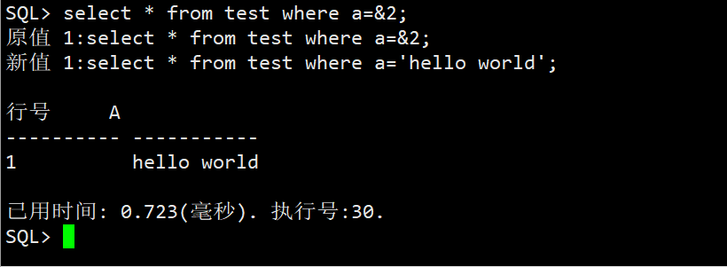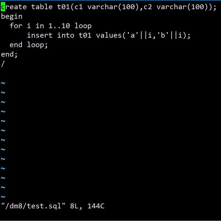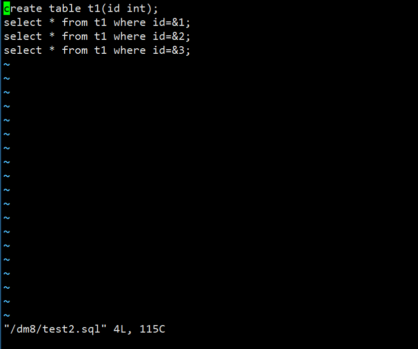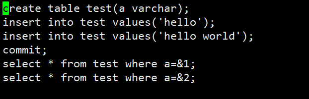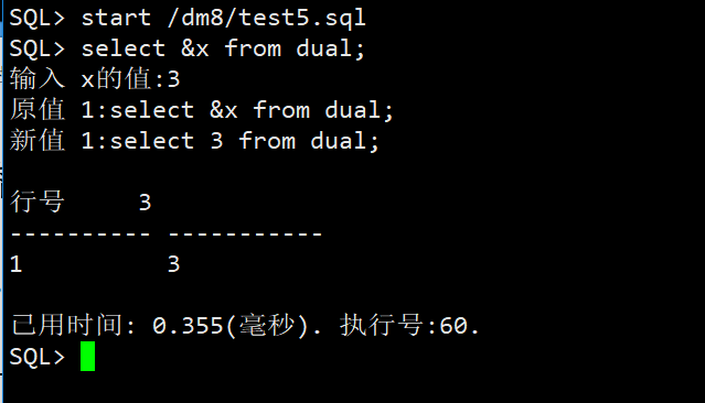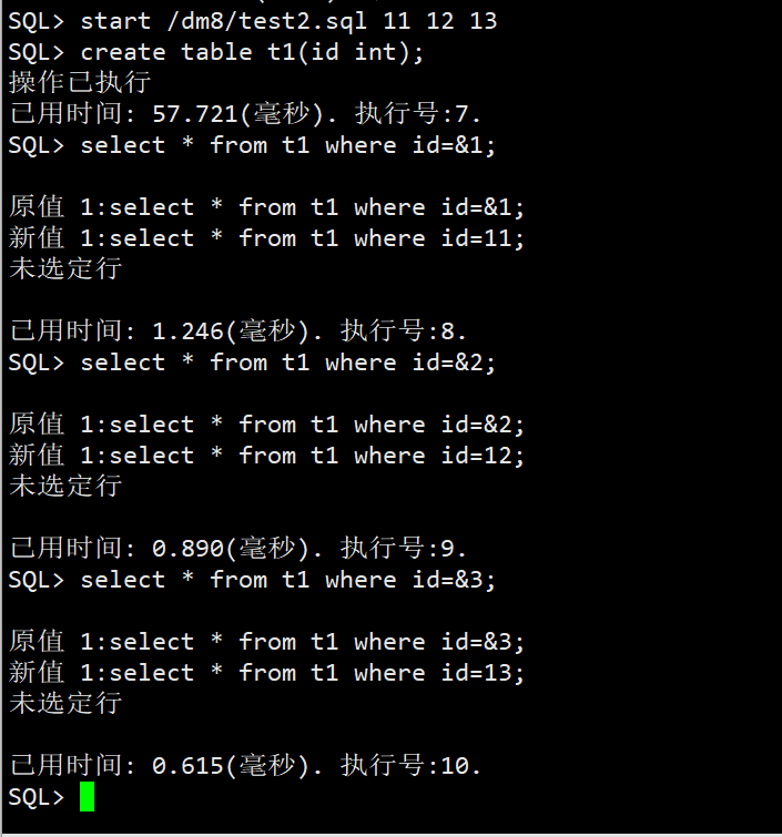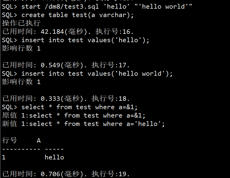 SQL>start dm8/test3.sql 'hello' "'hello world'"