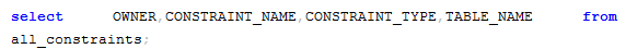 all_constraints中包含有当前用户拥有的所有约束信息,其中有约束的拥有者,约束名,约束类型,约束所在的表名或者视图名,但是没有约束所在具体字段的信息。