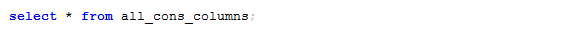 这一部分信息,我们可以在系统视图all_cons_columns中查找到。在all_cons_columns中,约束名,约束所在的表名和约束所在的列名包含在内,我们可以通过连接查询,找到需要查找的特定表的主键约束所在的列名。连接的列为CONSTRAINT_NAME,即约束名,在约束被创建的时候可以指定约束名,如果没有指定约束名,则会自动生成一个“CONS”加上一串数字的约束名,对于不同的约束其约束名是唯一的。