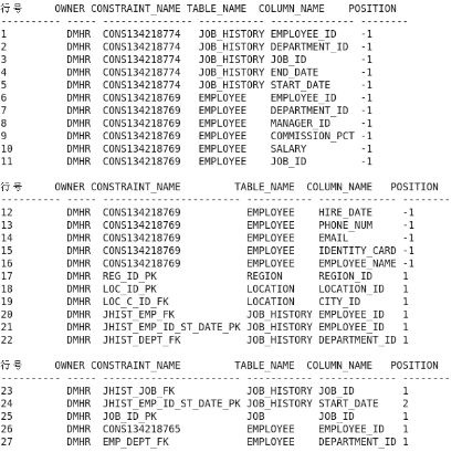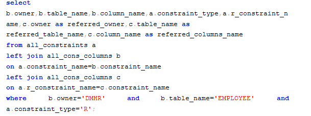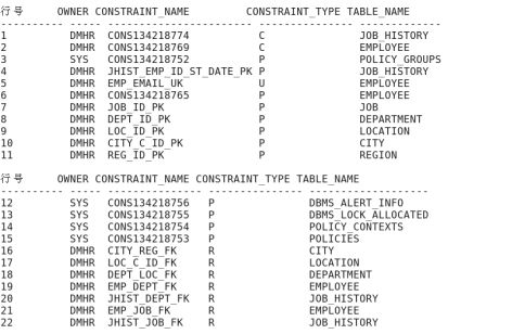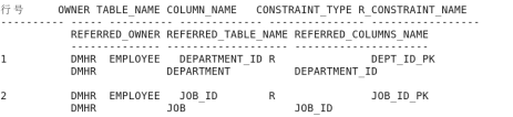 从查询结果看可以发现DMHR下EMPLOYEE表的主键为EMPLOYEE_ID列。其它表的约束信息也可以用同样的方式进行查找。例如在all_constraints中还有关于引用约束的信息,我们可以利用此信息找到引用约束的引用到的对应拥有者、表名、列名的信息。示例如下: