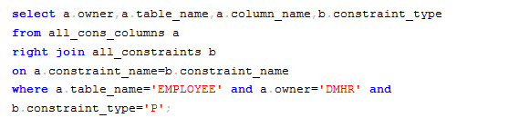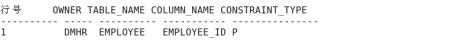 两个视图的连接查询可以获取特定表的特定列上的约束条件,一共有5种约束类型的值:C代表检查约束,P代表主键约束,U代表唯一约束,R代表引用约束即外键,V代表视图上的检查约束。需要找到某个表主键约束,可以限定where子句中的条件为CONSTRAINT_TYPE=’P’即可直接筛选出主键所在的列。假设我们需要找到DMHR示例库中EMPLOYEE表的主键所在列,查找方式如下: