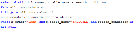 通过all_constraints视图我们还可以查找出表中所有的检查约束,利用SEARCH_CONDITION字段即可查出表中所有的检查约束。