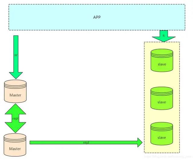 这种架构就集合前面两种架构的优点 优点 1、不存在master单点问题 2、减轻了写节点master的复制压力 缺点 1、写节点master挂了以后,另外一台master变成写节点,挂了的master启动以后,要把所有slave切换到这台启动的master上做数据同步。