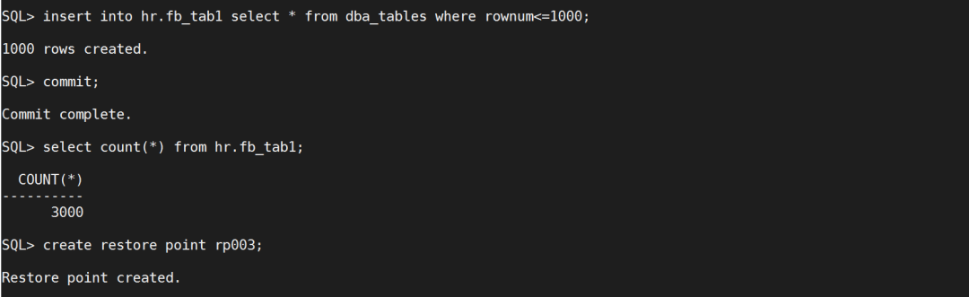 接下来,我们向这个表中添加1000条记录,认为是周二的数据情况,然后创建restore point名字为rp002。
