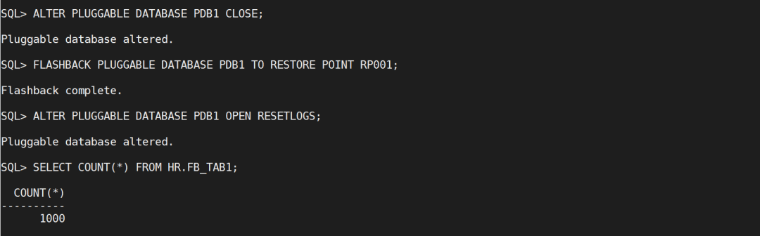 接下来,我们将PDB1关闭,然后闪回到第一个restore point:rp001,然后将数据库以resetlogs方式打开。我们通过观察,发现数据表中的记录恢复到了1000条。