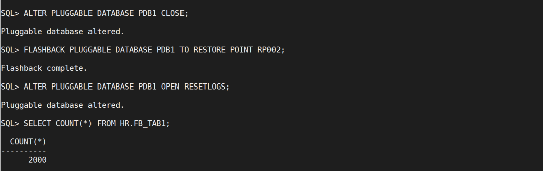 然后,我们再将数据库PDB1,闪回到第二个restore point:rp002,这项操作在之前的版本中是不支持的,而从20c开始提供了很好的支持。我们看到数据表中的数据已经恢复到了restore point:rp002的状态,有2000条数据。