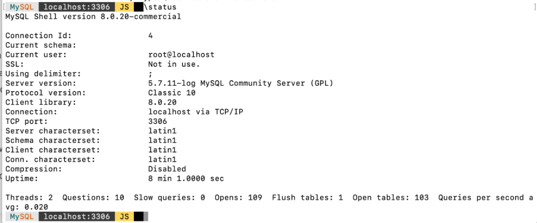 首先,使用MySQL Shell连接到MySQL服务器查看一下当前版本信息和状态。