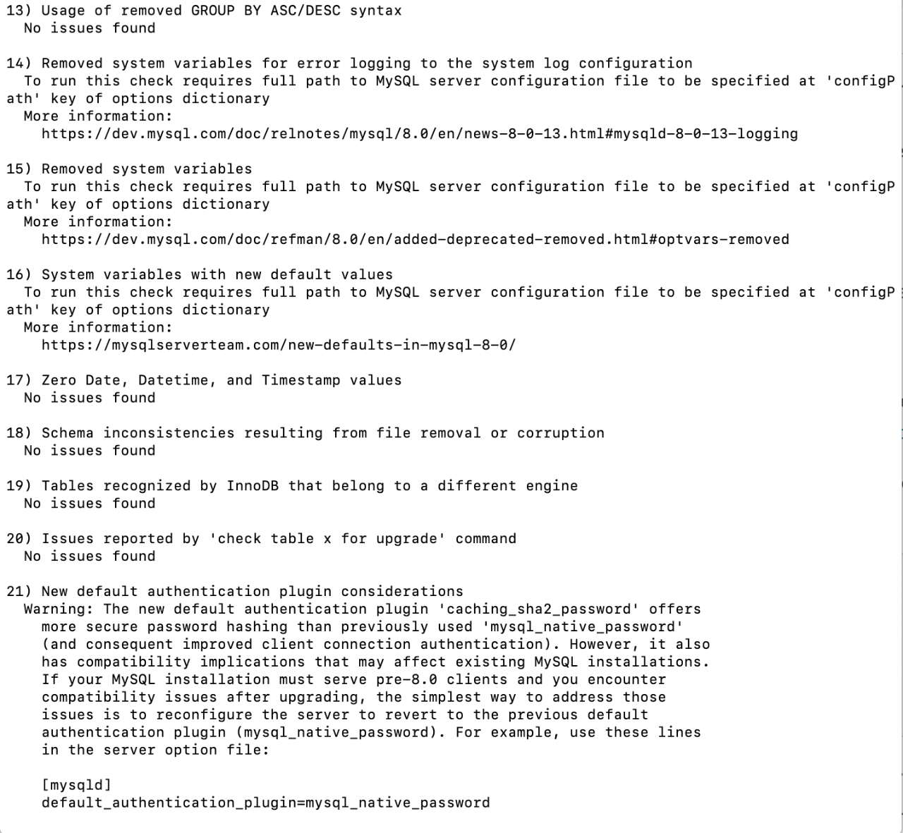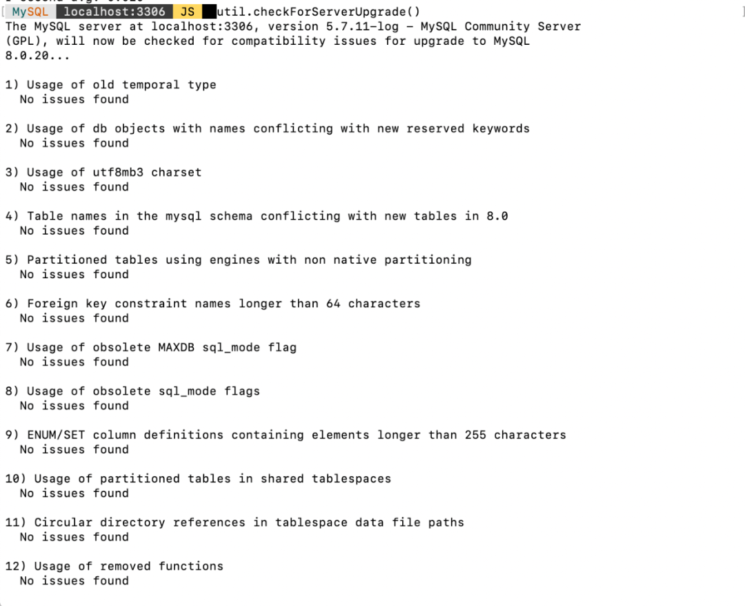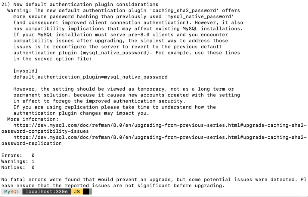 检查将返回在服务器上发现的升级方案错误和警告,在升级之前要将错误进行修改。修改错误后,还应该考虑进行进一步的修改以消除警告。这些配置修改将使服务器实例与目标版本更加兼容。MySQL8.0通过这个工具发现潜在问题,减少升级风险。
