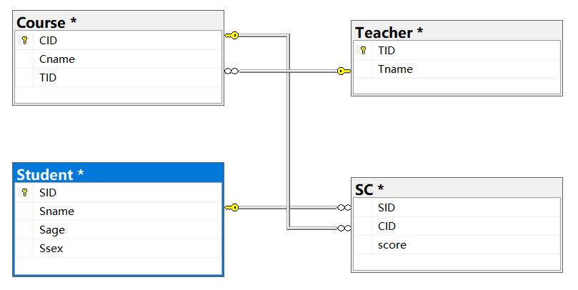 1、课程表Course的课程编号(Cid)作为主键,在成绩表(SC)中可以看到一个或多个学生的课程分数,两表之间是属于1:n的关系。同理学生表(Student)与成绩表(SC)也是1:n的关系