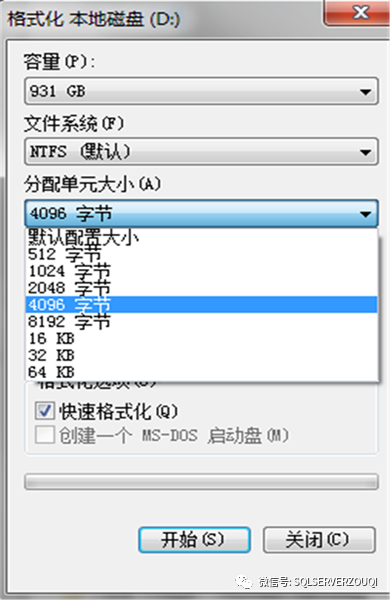 先来看看和这个问题相关的Allocation Unit。我们在格式化磁盘的时候, 会有一个选项叫做分配单元大小(Allocation Unit),如下所示: