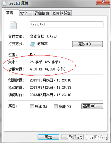 我下面图显示所以我的文件test.txt大小是26字节,但是占用空间是4kb。这是因为我磁盘的AU是4kb的缘故