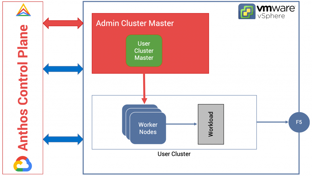 Antos要在内部启动托管的Kubernetes集群,它依赖于vSphere 6.5、vCenter、vSphere存储和F5 BIG-IP或基于谷歌开源项目Seesaw的捆绑软件负载均衡器。Anthos首先在vSphere中提供了一个管理集群(它可以生成多个用户集群)。把该管理集群看作本地Antos控制平面,它处理vSphere中运行的托管集群的生命周期。