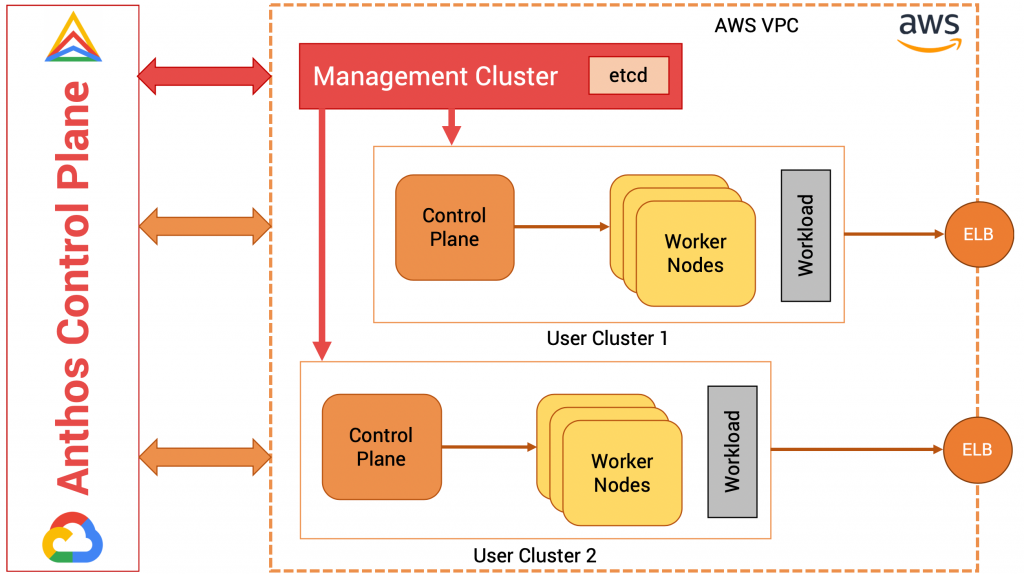 Antos for AWS于2020年5月GA,它可以在AWS环境下运行托管的Kubernetes集群。利用Amazon EC2、Amazon EBS、AWS VPC和Amazon ELB,Anthos可以启动高可用性的Kubernetes集群,这些集群跨多个可用区域。与vSphere中的管理集群类似,Antos首先在AWS VPC中启动一个管理集群,它负责启动其他用户集群。