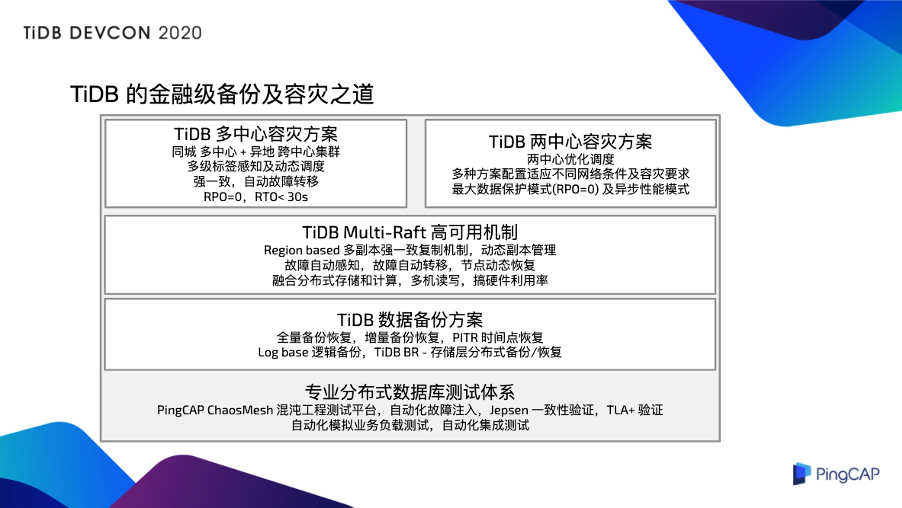以上是我们交付给用户的多种金融生产级的灾备容灾的方案,它背后的支撑是由核心的 TiDB 的 Multi Raft 的高可用机制,以及一系列针对跨中心的调度、数据的调度管理、故障的自动转移判断等这一整套后台的保障技术机制来实现的。