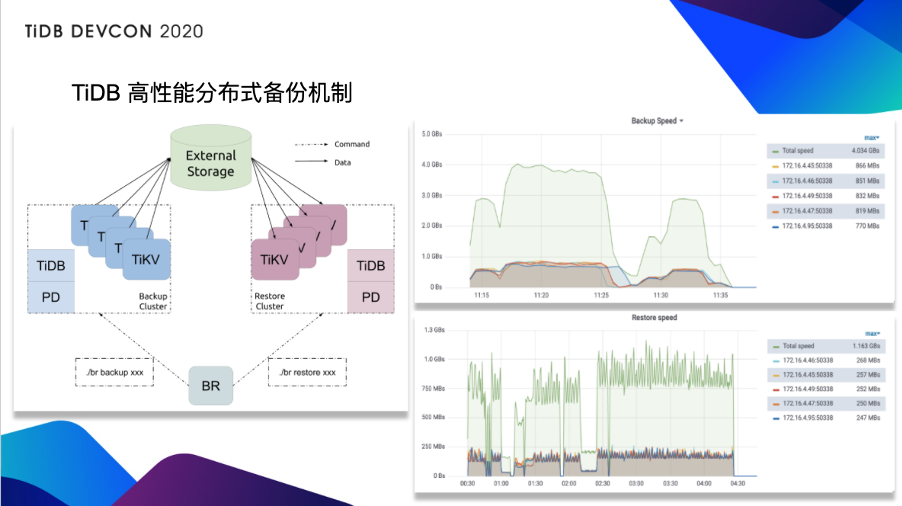 刚刚我还提到一个叫 TiDB BR 的工具,它是一个在存储层实现高性能分布式数据备份恢复的工具。所以,大家由下图可以看到,我们的测试中的备份速度、恢复速度,都是非常惊人的。而且随着节点数量的增加,在数据量一定的前提下,备份/恢复的性能都会有接近线性的增长: