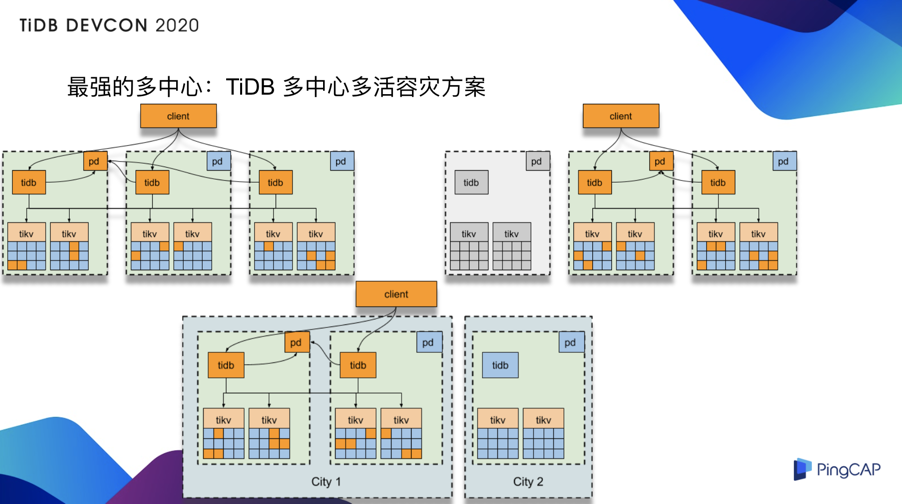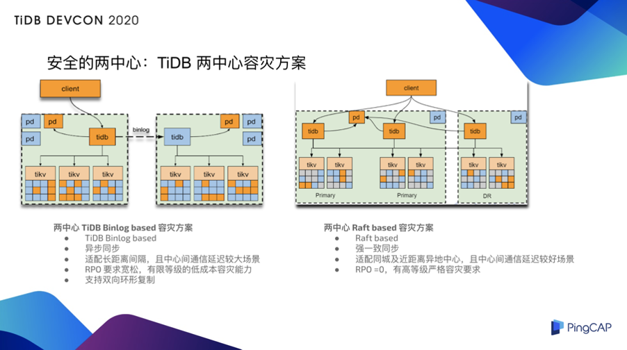 除此之外,在国内的话,从北到南,我们的运营商的线路也是非常的复杂。对于有些用户来说,从投资成本、业务的重要性、客户网络的物理条件来说,没有办法去构成同城多中心加异地的的容灾架构,他可能只能选择两中心的方案,那么在这个过程当中的话,TiDB 经过这几年对这个方面的积累,我们现在已经有了两中心的容灾方案,并且,在这个方案里面,我们有多种配置来适应不同的网络条件。即便是在两中心方案当中,我们也能达到 RPO 等于 0 的保护模式。当然也有一些用户的场景,他的网络线路可能延迟非常高,且用户要求有一个托底的容灾方案,同时对于数据的一致性可以有略微的放松和让步,在这个过程当中,我们也会通过配置来为其提供异步同步的模式,来帮助其实现托底的容灾方案,最大程度保障服务的连续性和数据安全。