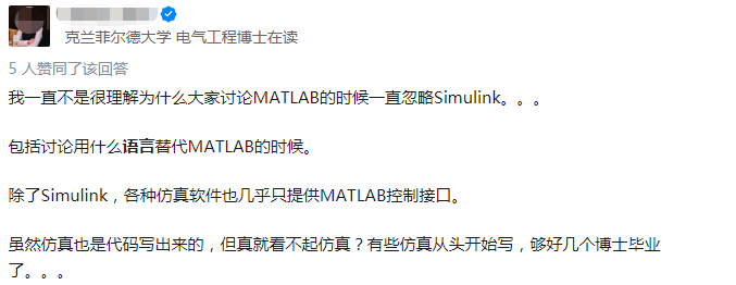 但也有人指出,虽然 MATLAB 可以被其他语言替代,但 Simulink 仿真却很难找得到替代品。