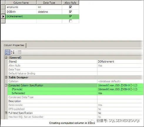 公司要求我们把每个员工的“退休日期”设置为(DOBirth + 60年 - 1天)。我们不是每次在报表中都计算它,也不是每次[DOBirth]更新时都通过一个触发器来更新[DORetirement]列,而现在有一种更好方法把[DORetirement]作为一个计算列创建。由于这个规则可以在任何时候更改,因此我们把它作为一个计算列来执行而不是一个硬编码值。