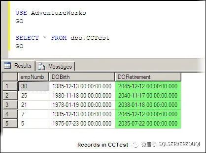 我已经在SQL Server 2005和SQL Server 2008中测试了这些脚本。在下面的脚本中,我们将在AdventureWorks数据库中创建一张叫做CCtest的表以及三个字段[empNumb],[DOBirth],[DORetirement]。