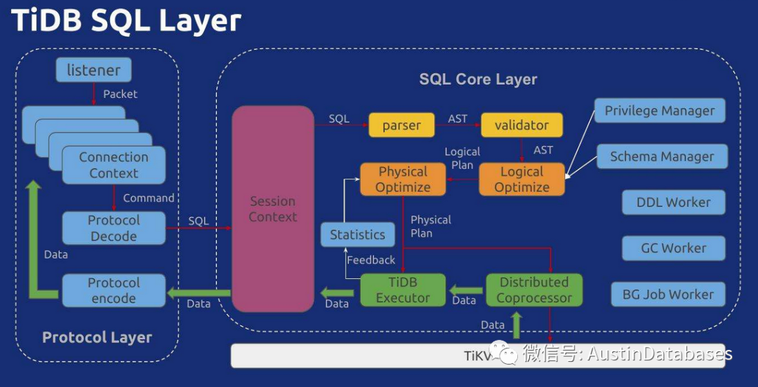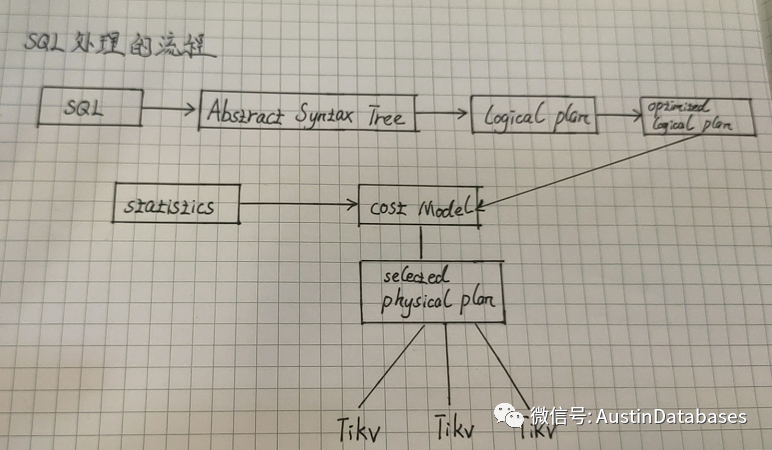整体的SQL 处理流程, 如果是计算 COUNT , 则TIDB PD获知这些数据在那个 region 中,region 根据where 条件,将符合的条件的数据进行累加和,最终每个region将自己的累加和汇总到 TIDB SERVER ,在进行聚合SUM。