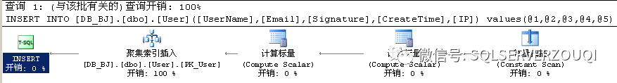 我们从执行计划的各个步骤看一下这个insert的执行过程,注意看SQL Server的执行计划要从右往左看.