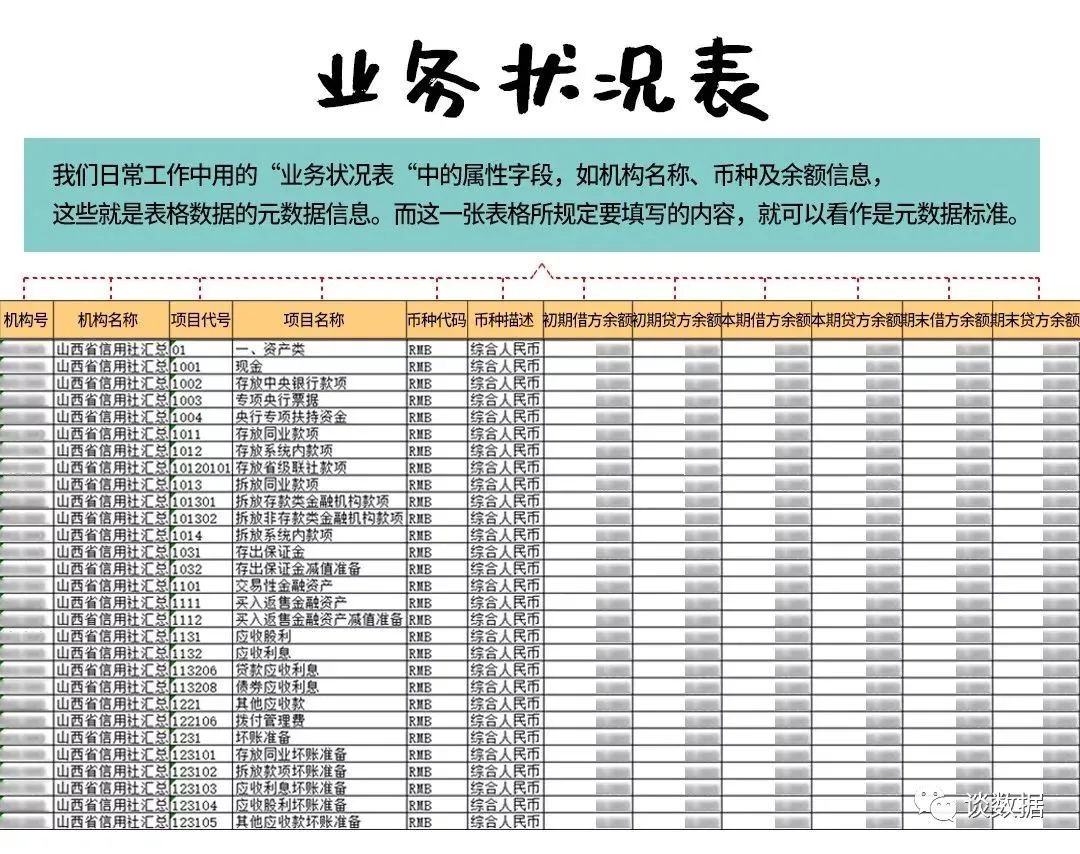 还有“财务状况表”中的属性字段,如:机构名称、项目名称、币种、余额信息等都是这张表格的元数据信息。