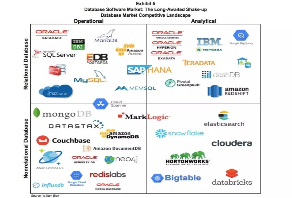 首先我们先从数据行业的整体情况入手。在下图中,按照两个维度针对场景做个划分,其内部标识部分主流厂商。纵向按关系型与非关系型,横向按照操作型与分析型做了划分。重点关注下右上角分析市场的情况。在这里的玩家,按厂商定位大致分为两类。一类是老牌的数据库厂商,以TeraData、IBM、Oracle为代表;一类是新兴云服务商,以Google、Amazon、Azure为代表。此外还包括右下的一些大数据厂商,也可在数据分析场景中使用。