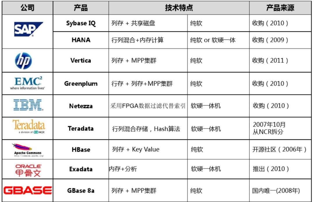 针对非云服务商,可以简单整理为下表。可以看到主要是以老牌传统厂商为主。而且很有趣的现象是,除了TeraData外,基本都是巨头厂商收购产品形态为主。这些厂商在过去的近二十年里成为数仓领域的主导性力量,满足了广大企业级用户的数据分析诉求。但这一现象,正在最近几年发生不小变化。