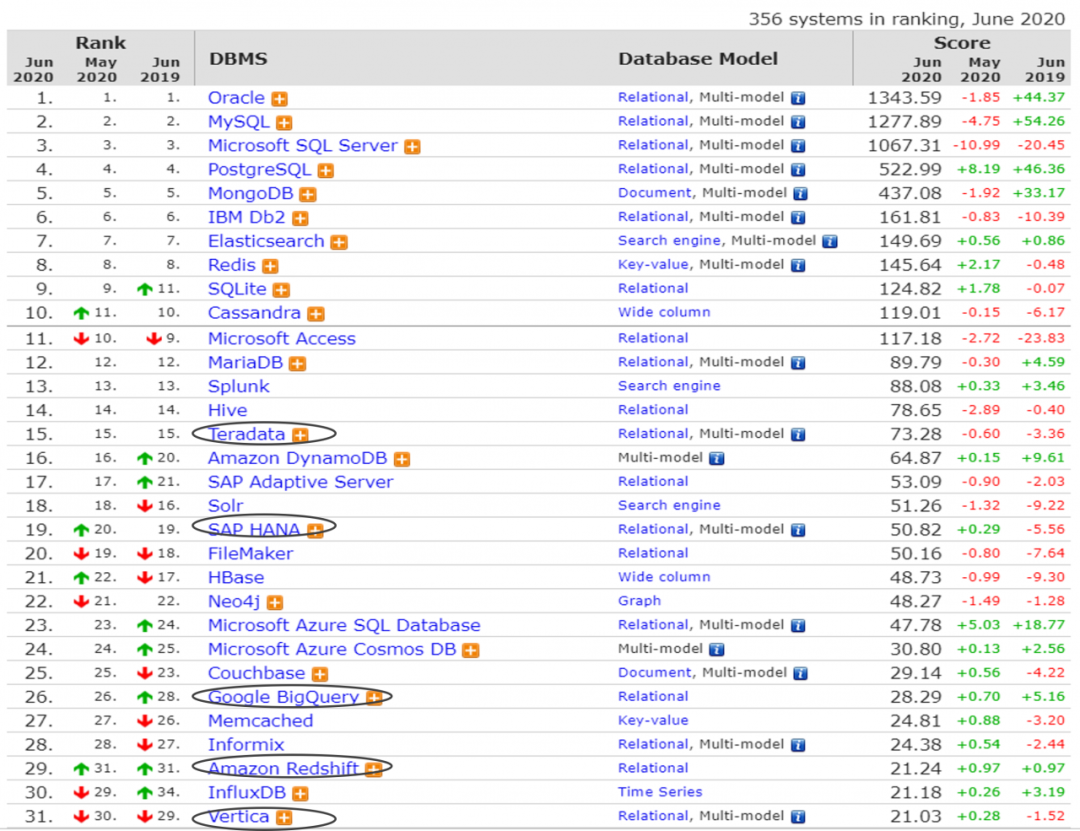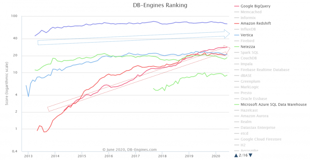 下面我们从数据库排名角度,看看两类玩家的趋势变化。下图中根据最新的DB-Engines Ranking的数据进行近十年的趋势变化分析。对比以TeraData、Vertica、Netezza为代表的传统厂商,和以Google BigQuery、Microsoft Azuere Data Warehouse、Amazon Redshift为代表的云服务厂商。从绝对数字可见,传统厂商仍然领先(特别是TeraData,领先明细);但从增长趋势来看,后者涨幅更为快速。在2020年,主要厂商已经开始交叉,相信不久之后将全面超越并逐步逼近TeraData的领导地位。