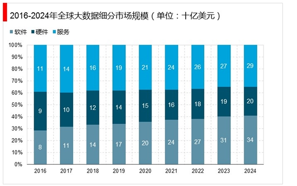 我们以大数据整体市场(含数据分析)来看。下图是全球的市场规模的变化。在从软件、硬件、服务三者来看,整体市场规模从2016年的280亿美金预测到2024年增长到830亿美金。在三者比例中,软件部分增长更快。