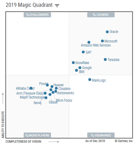 在2019的Gartner报告(2020还没出)中,TeraData作为专注于数据分析的厂商出现在领导者象限。并在单一领域保持了十余年的领先地位。