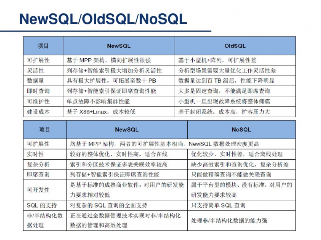 从技术发展来看,走过了OldSQL->NoSQL->NewSQL的道路。
