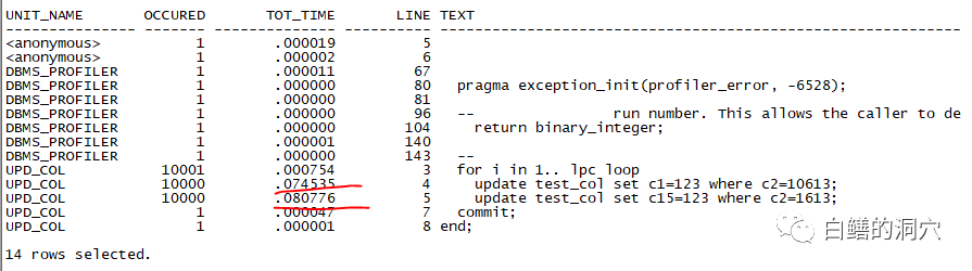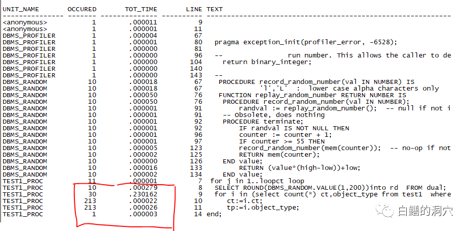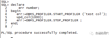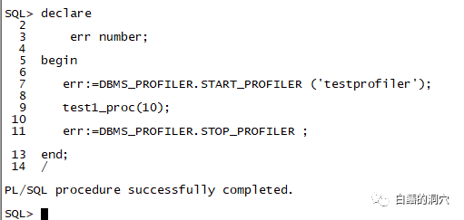 declare err number; begin err:=DBMS_PROFILER.START_PROFILER ('testprofiler'); --启动 profiler测试 test1_proc(10); err:=DBMS_PROFILER.STOP_PROFILER ; end; / |