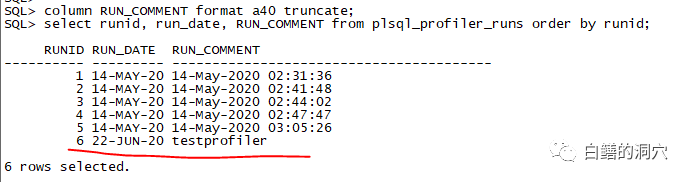 column RUN_COMMENT format a40 truncate; select runid, run_date, RUN_COMMENT from plsql_profiler_runs order by runid; |