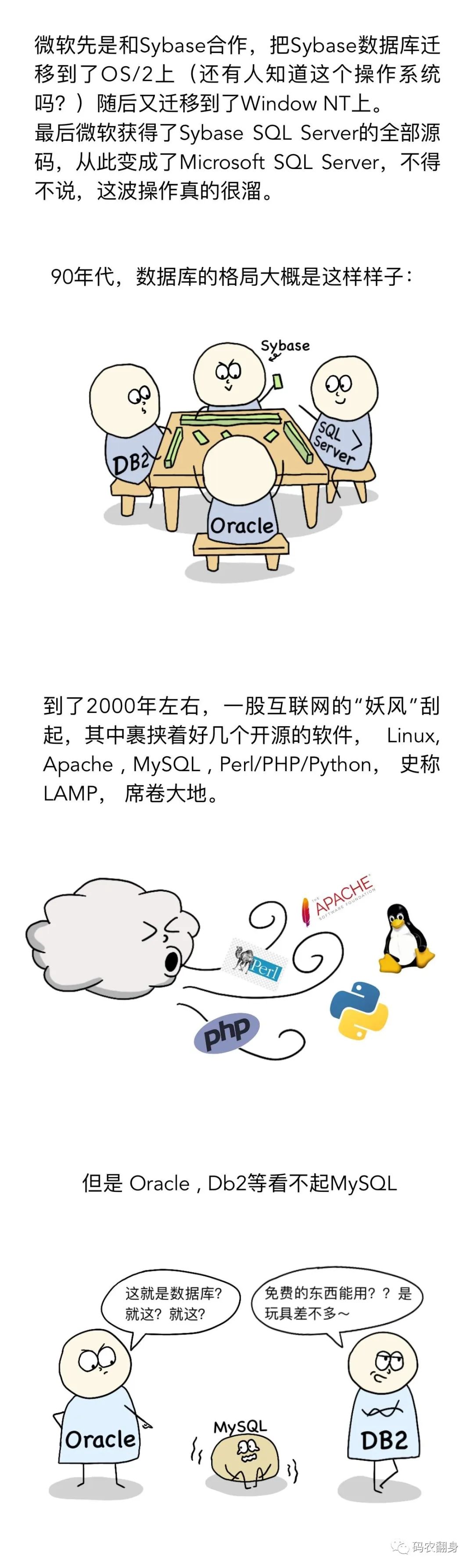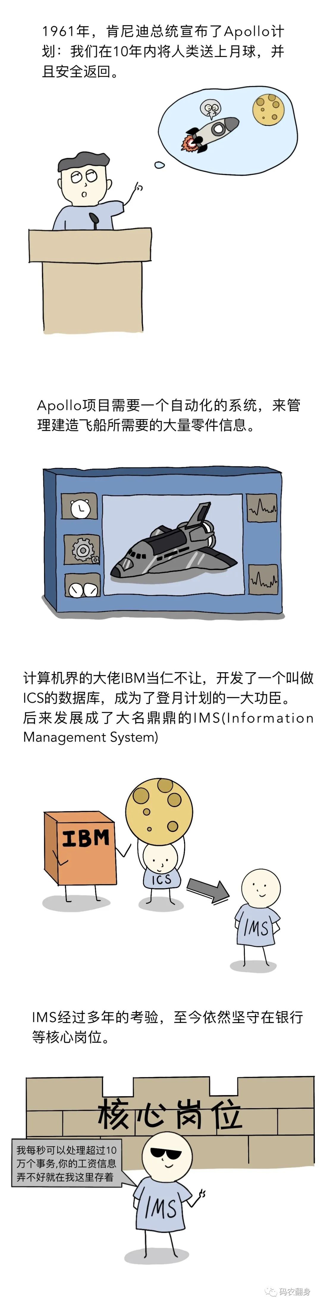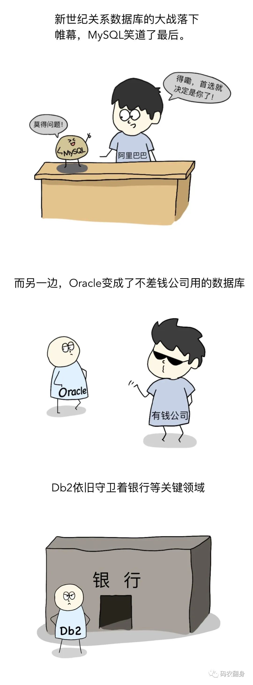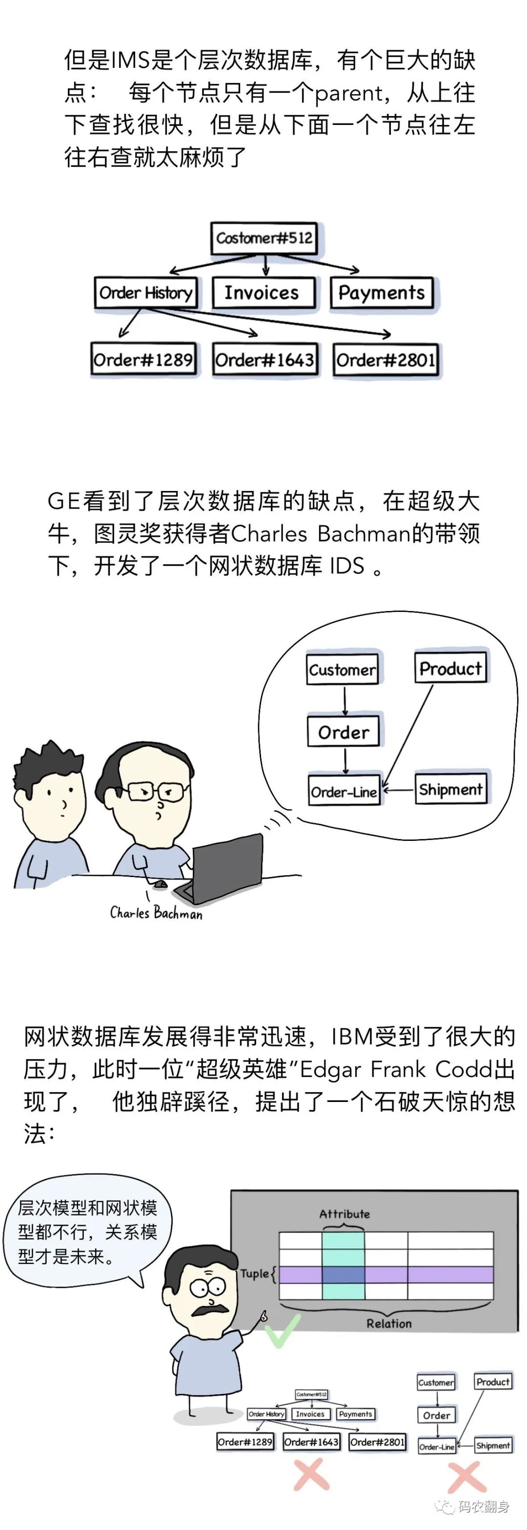 后记:这篇漫画文章简单回顾了数据库60年的发展历史,从大机时代,到局域网时代,再到互联网/移动互联网时代。数据库的王者是谁?其实是一代新人换旧人而已。由于篇幅所限,并没有把所有的数据库都囊括其中,比如dBase, FoxPro, Access等桌面数据库就没机会出场,Informix,SQL Anywhere, 列式数据库等也没有介绍,在数据库的发展历史中,一共产生了4位图灵奖获得者,文章中提到了两位,分别是开发网状数据库的Charles W. Bachman和发明关系模型的Edgar F. Codd, 第三位是对数据库事务有巨大贡献的James Gray, 第四位是开发了Ingres 的Michael Stonebraker。