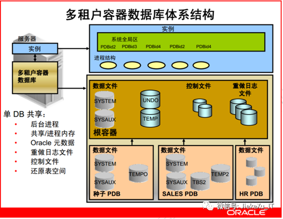 如上图所示,在多租户架构下,单个 DB 共享后台进程,内存,以及重做日志文件,控制文件以及位于根容器的元数据,undo 表空间在 12.2 以后的版本中实现本地管理,位于各自的 PDB 中。那么,对于像参数文件,密码文件,告警日志等均有一份,因为实例只有一个,PDB位于数据库中可以是多个,12.2 以后的版本中可以有 4096 个。