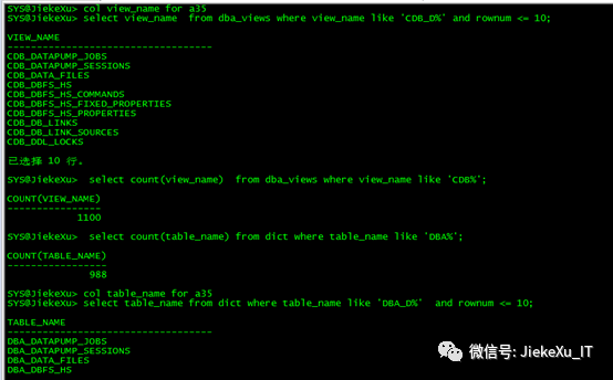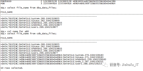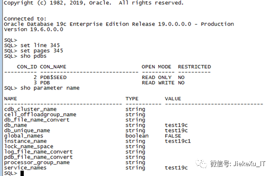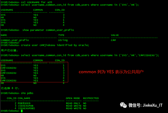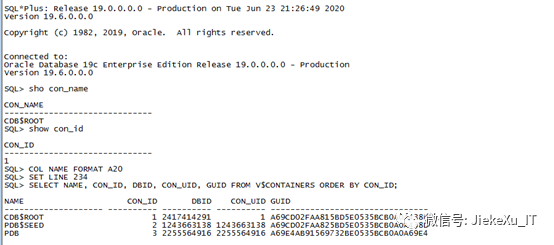 SYS@JiekeXu>SELECT NAME, CDB, CON_ID FROM V$DATABASE;NAME CDB CON_ID------------------------ ----------JIEKEXU YES 0SYS@JiekeXu> sho pdbsCON_ID CON_NAME OPEN MODE RESTRICTED---------------------------------------- ---------- ----------2 PDB$SEED READ ONLY NO3 JIEKEXUPDB READ WRITE NO4 JIEKEXUPDB1 READ WRITE NO