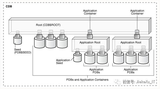 3)零个或多个应用程序容器:应用程序容器仅由一个 application root 和插入到这个根的 PDB 组成。系统容器包含 CDB 根目录和CDB中的所有 PDB,而应用程序容器只包含插入到应用程序根目录中的PDB。application root 属于 CDB 根,不属于其他容器。