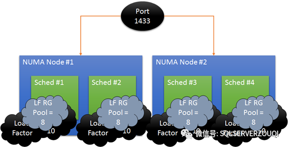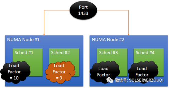 新的数据库连接分配:新的连接是用环形循环分配,和前面提到的一样。所有的sql server 2012 产品都是这样分配连接的,首先查询目标NUMA节点内所有调度器的负载,然后选择把数据库连接分配给负荷最小的调度器,在连接的生命周期中,这个调度器变为这个连接的首选调度器。