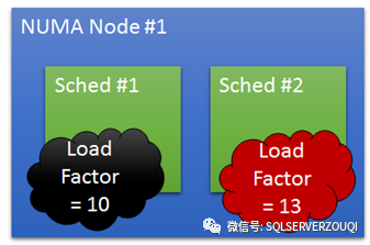 这个比较简单,因为SQL Server 2012之前和SQL Server 2012非企业版无法识别NUMA节点,当task进来时,使用首选调度器,如下图,在Node1的调度器 sched#2上跑,当load factor是其他调度器120%以上的时候就需要重新选其他调度器。