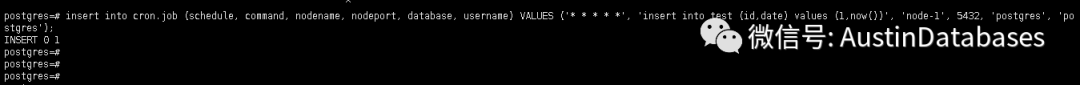 INSERT INTO cron.job (schedule, command, nodename, nodeport, database, username) VALUES ('0 4 * * *', $$call insert_D('a','b')$$, '192,.168.198.120', 5432, 'postgres', 'job');