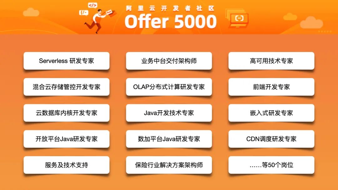 既然要 “Offer 5000”,那么重点当然是投递简历啦!本次招聘覆盖前端、后端、架构等职位,涉及云原生、数据库、大数据、IOT 等多个领域。从今天开始,你可以前往“阿里云开发者社区 Offer 5000”活动页查看所有待招聘岗位的详情并进行简历投递,一切流程都有专门的小姐姐负责跟进,各阶段都会有结果给你反馈哦。参与本次 “Offer 5000” 活动的部分待招聘岗位“Offer 5000”不仅为大家带来大咖直播、简历投递等内容,还集成了阿里云开发者社区上最优质的的面试真题、面试经验以及其他一手资料,助你先人一步了解阿里云面试流程和要求,最终斩获 Offer。面试准备过程中,你一定想要和志同道合的小伙伴一起学习和讨论,阿里云开发者社区为大家建立了专门的讨论钉群,想要加入的同学们请点击文末的“阅读原文”链接哦。